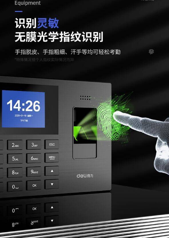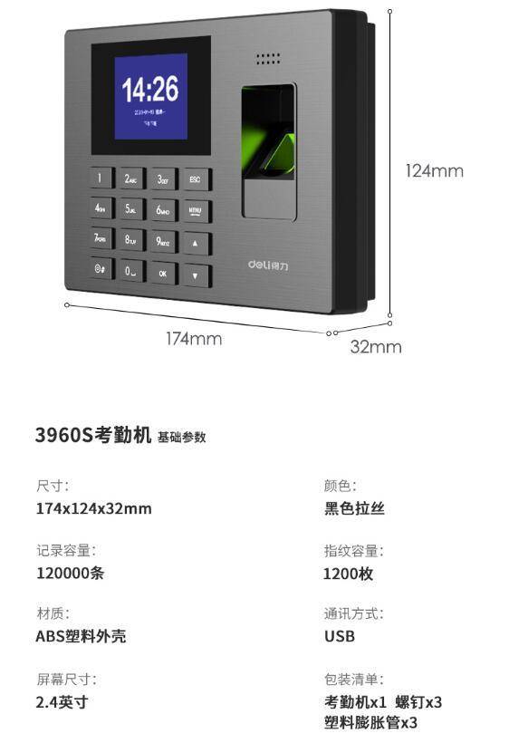 得力 3960S 大容量指纹考勤机(黑色)(台) 快速识别