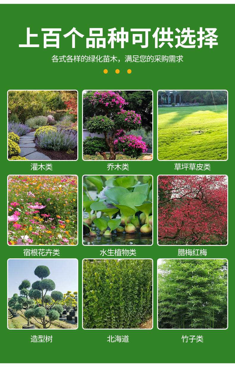花坛,盆栽,护坡绿化,切花材料,花境,绿篱,地被,灌丛,湿地绿化