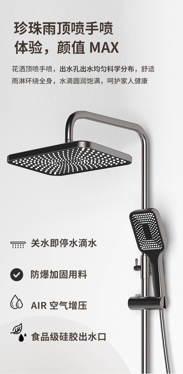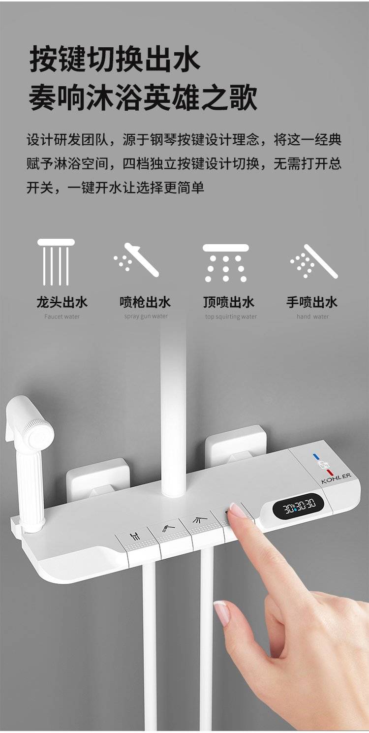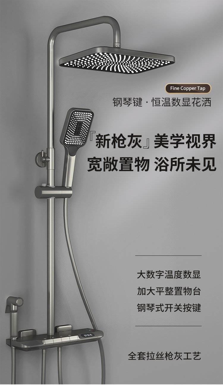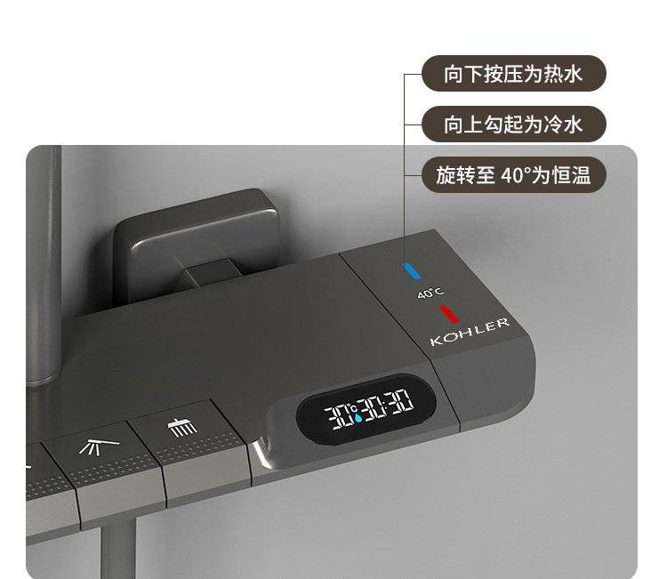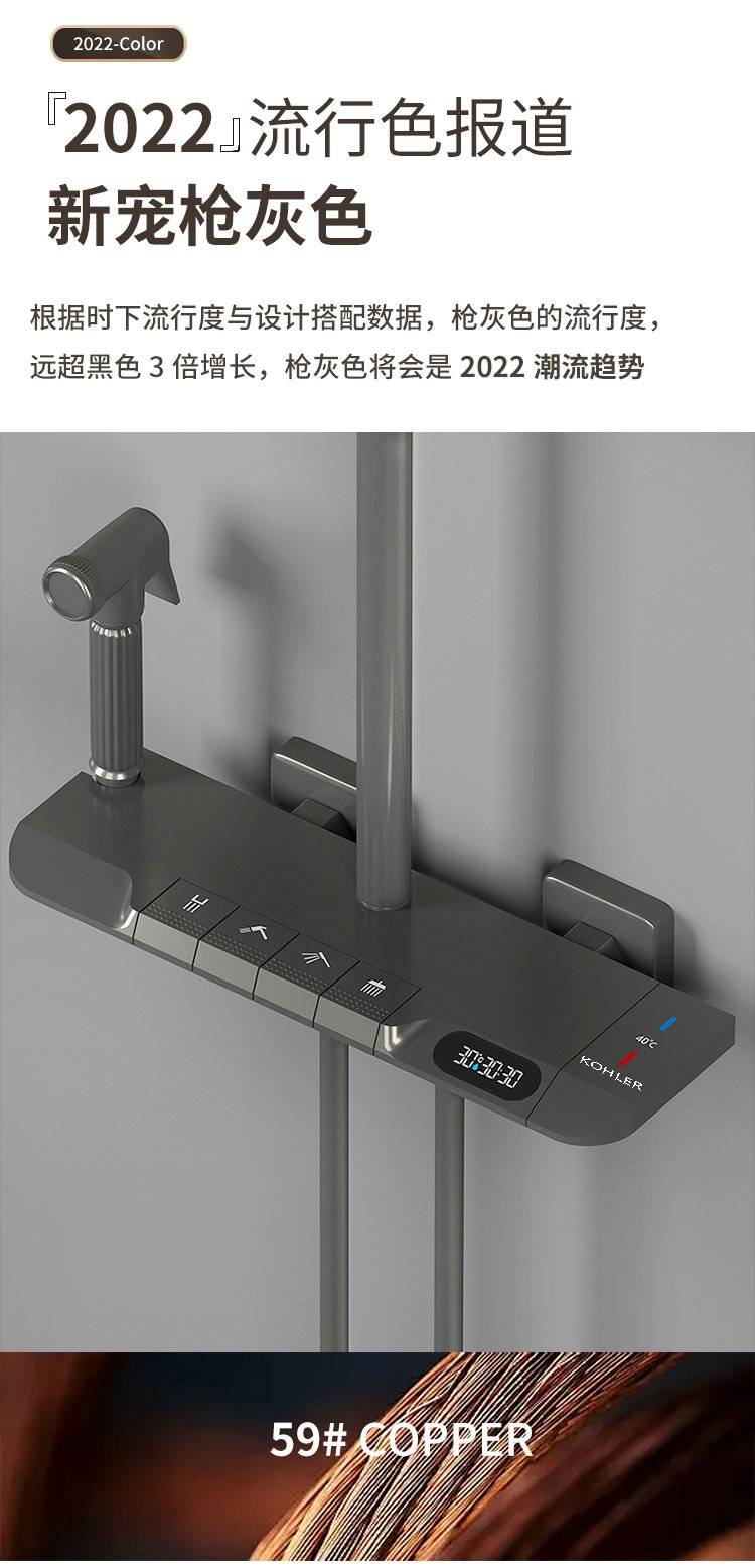科勒卫浴淋浴花洒套装枪灰色全铜数显花洒钢琴增压家用沐浴器