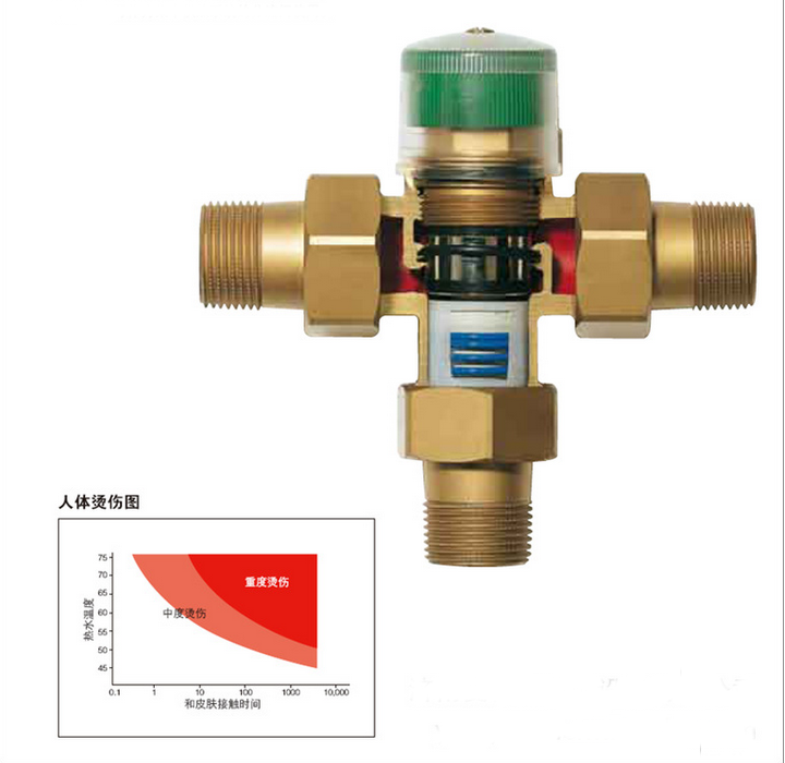 恒温混水阀内置高灵敏感温系统,能够根据用户设定的温度要求, 动态调节冷热水的混合比例,使出水温度一直恒定在设定温度,保证用户安全舒适的使用,同时避免热水温度过高,造成烫伤等严重后果。出于严格安全的设计,在冷水停止供应时,混水也不会烫到用户。该恒温混水阀也可以用在采暖供热和太阳能热水系统,使锅炉或太阳能集热罐出水和系统回水( 或冷水) 混合到设定温度的系统给水。另外,也可作为集中供热系统的分流阀使用。r