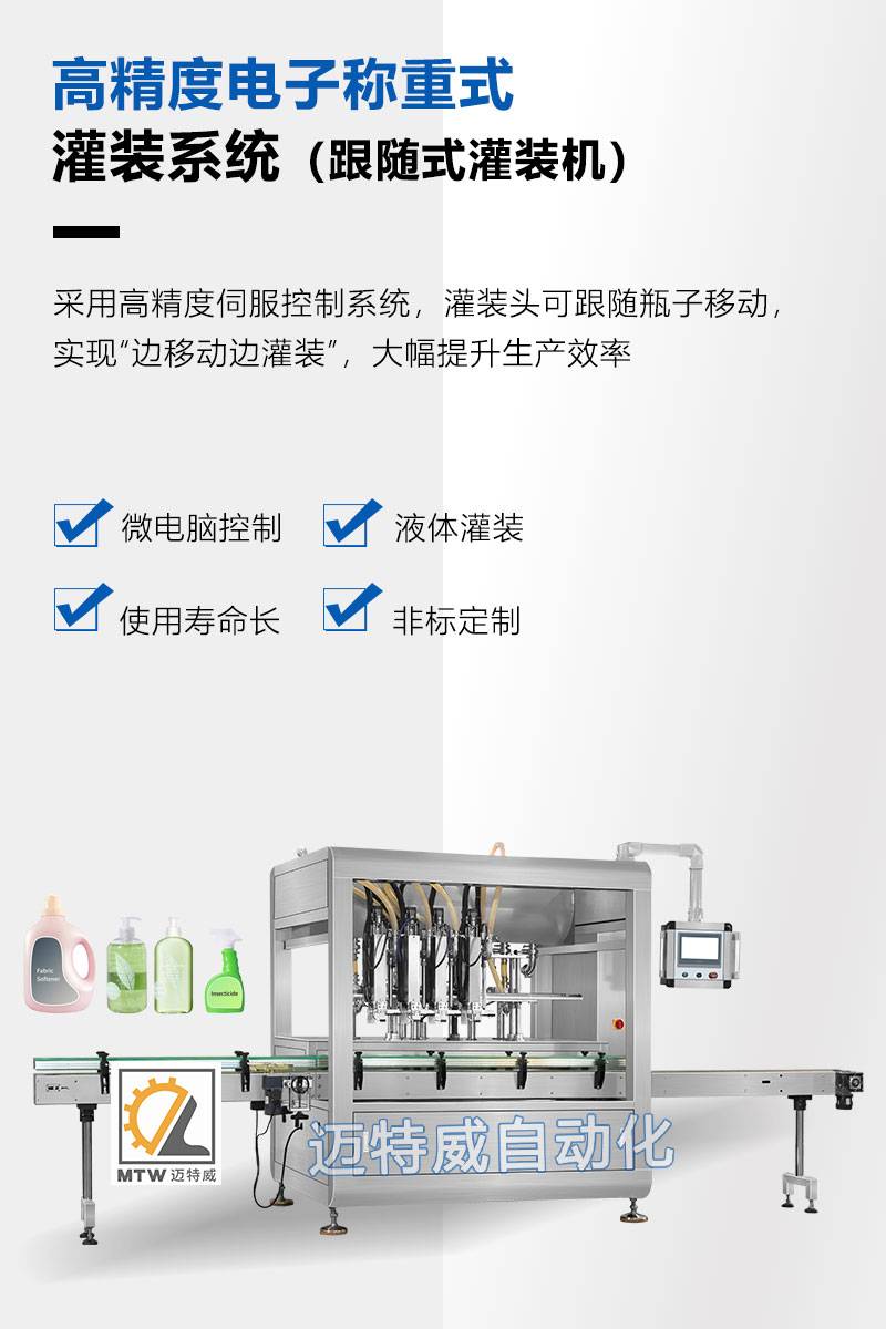 迈特威伺服定点跟随式灌装机 日化食品自动灌装设备 移动式兼容广
