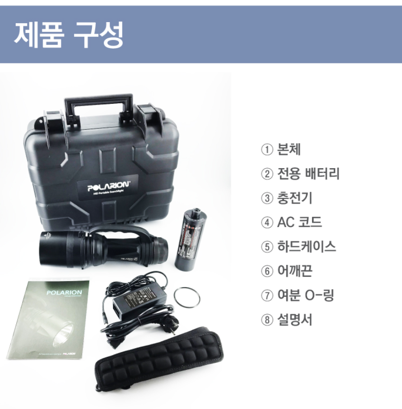箱子1个, 灯1个, 电池1个, 充电器1个, 说明书1个, 袋子1根, 密封圈1个