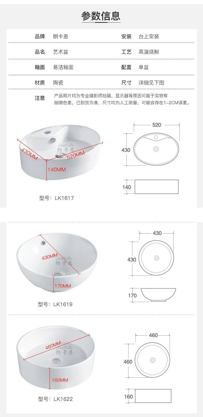 朗卡恩定制阳台陶瓷面盆 艺术洗脸盆 家用现代简约卫生间洗手盆