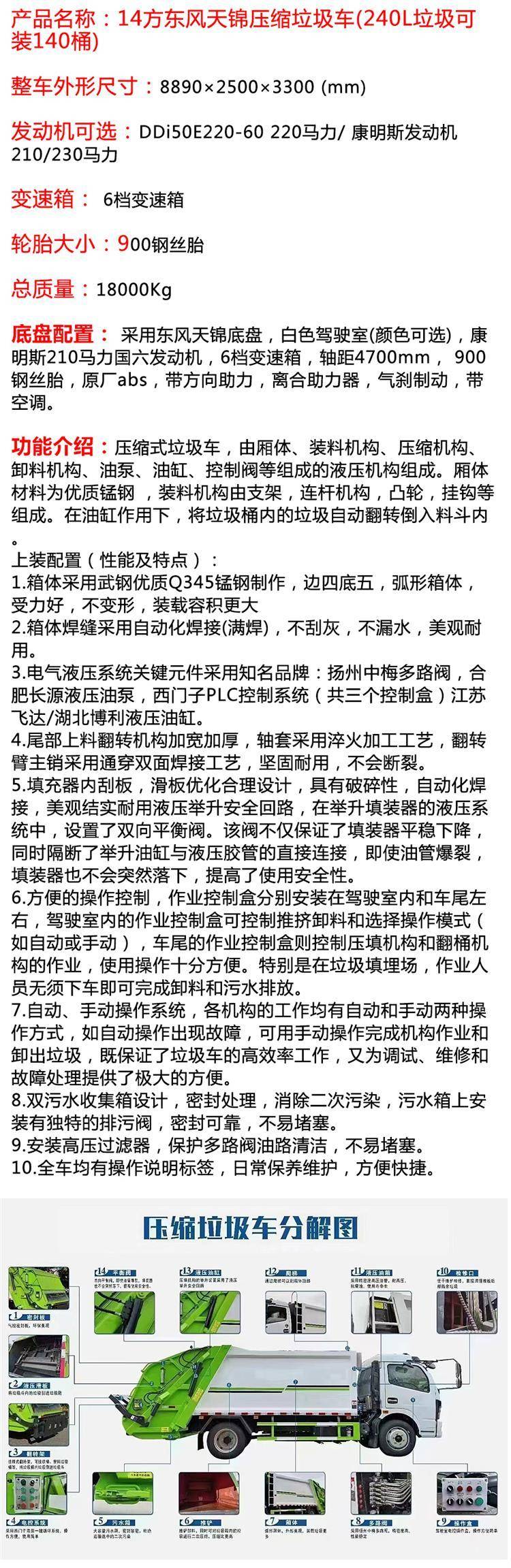 东风天锦压缩式垃圾车 定制规格全 自装自卸 续航持久