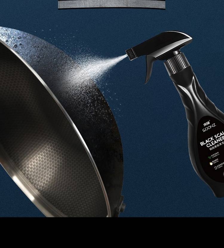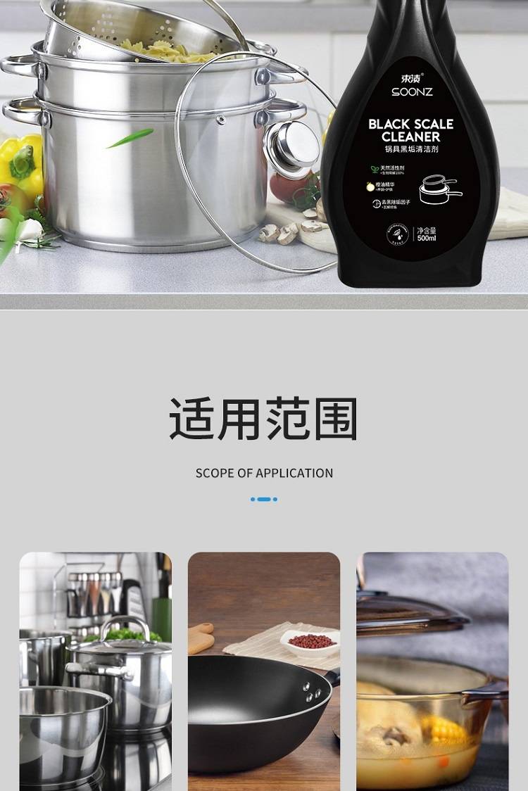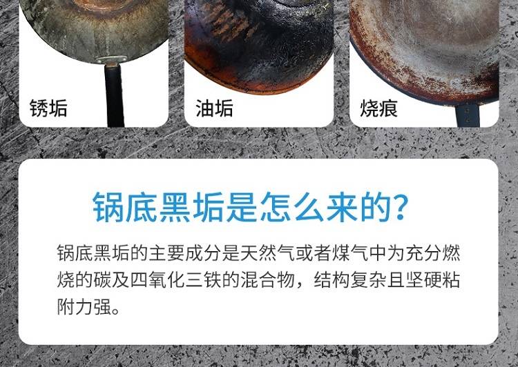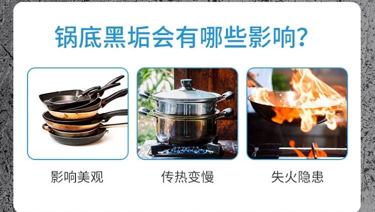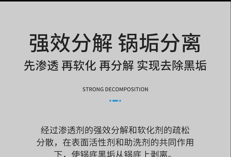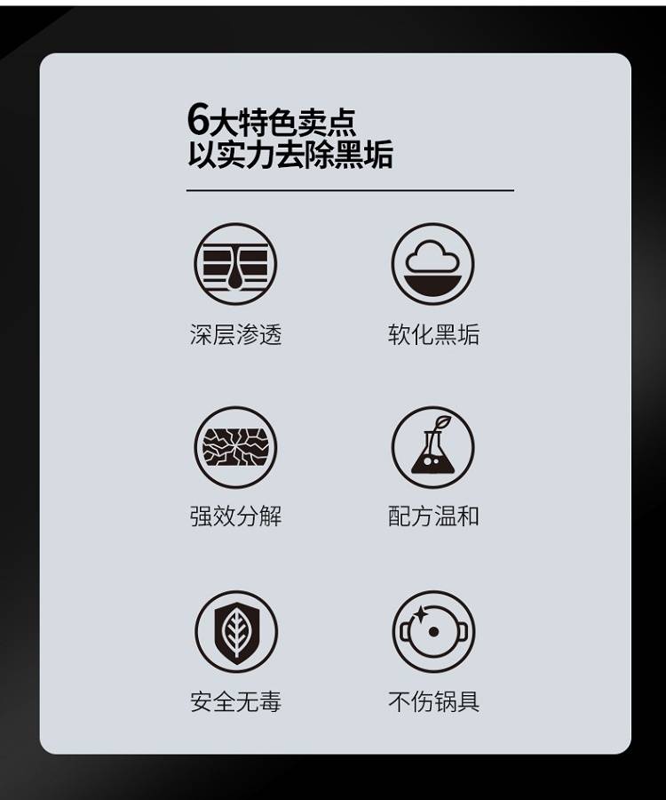 以实力去除黑垢,深层渗透软化黑垢,强效分解,配方温和,安全无毒不伤锅具