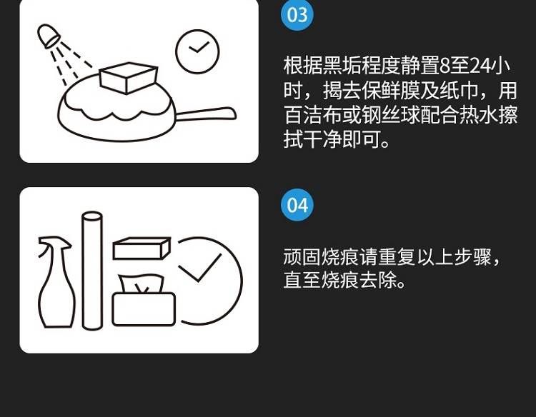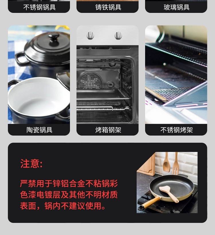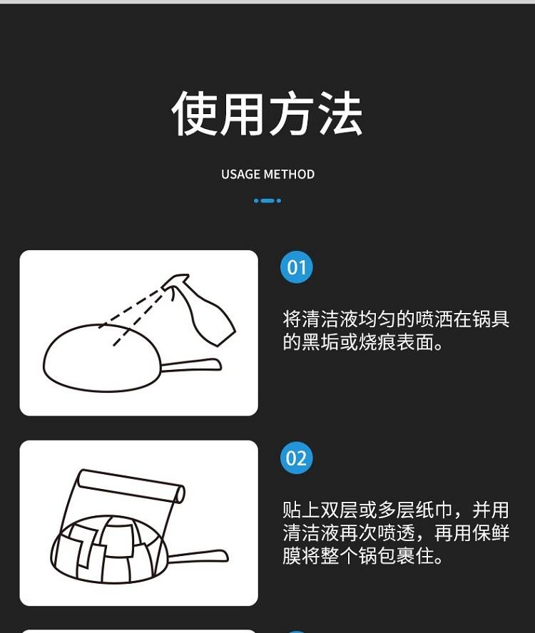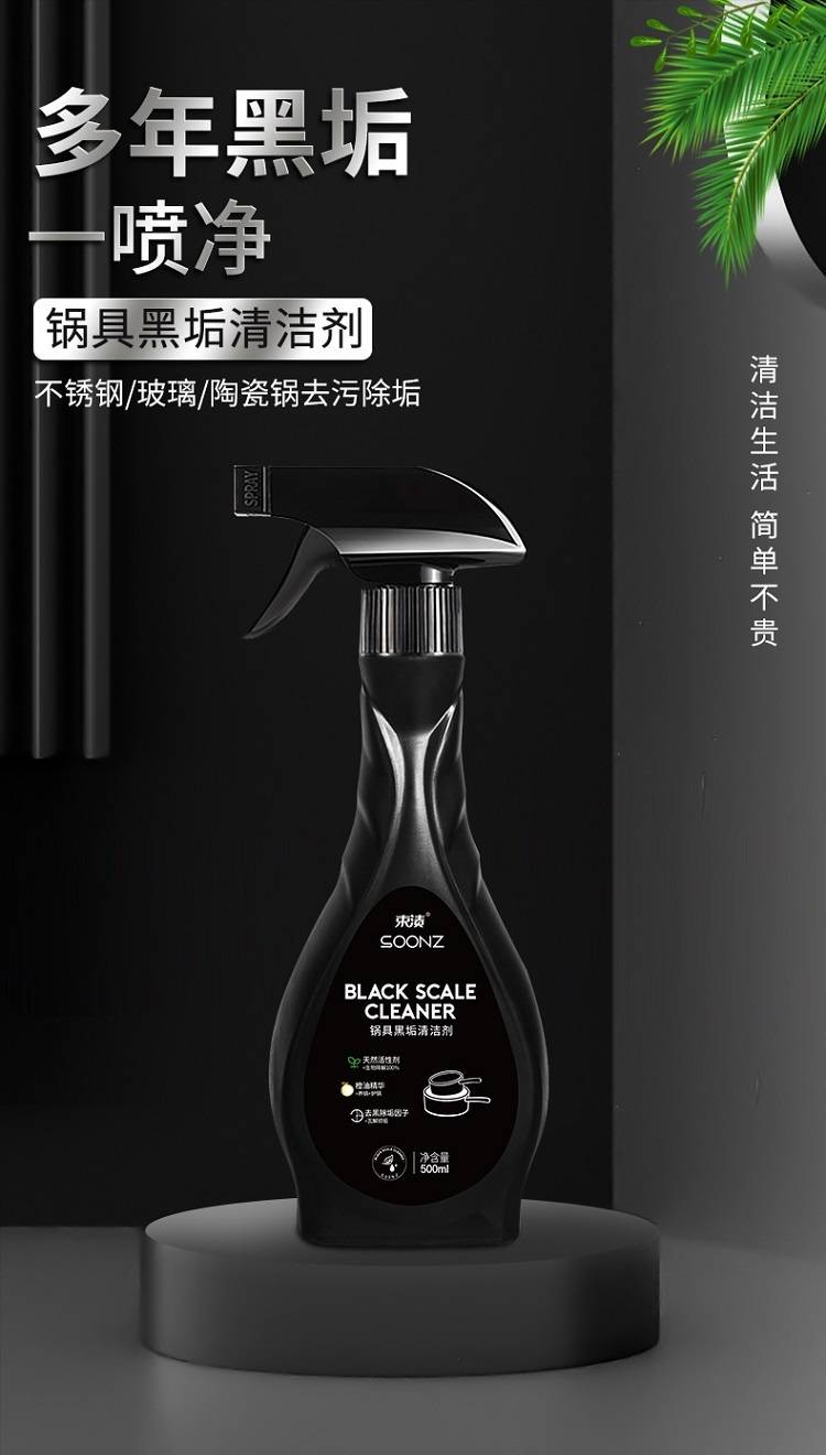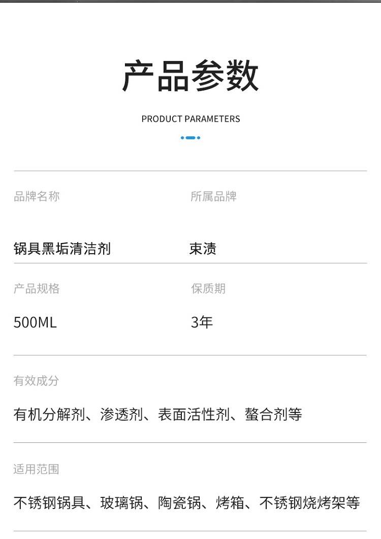 以实力去除黑垢,深层渗透软化黑垢,强效分解,配方温和,安全无毒不伤锅具