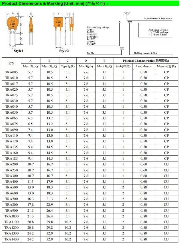 TRA(16V) 电子元件器 插件高压自恢复保险丝16V-600V
